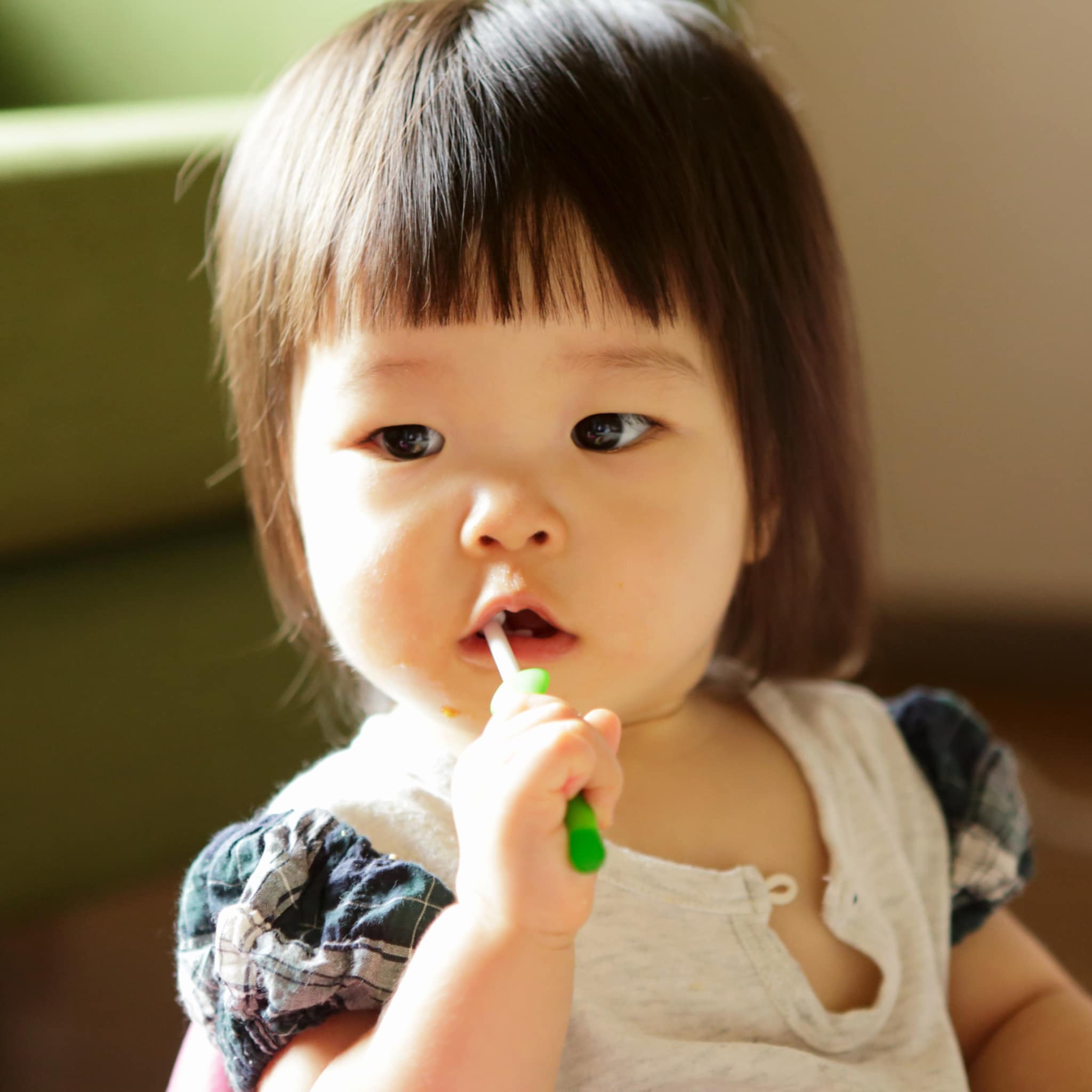‘Gebruik bij de oefenhapjes een kunststof lepel in plaats van metaal. Kunststof is zachter en minder ‘koud’ dan metaal en voelt daardoor een stuk prettiger aan voor je baby.’