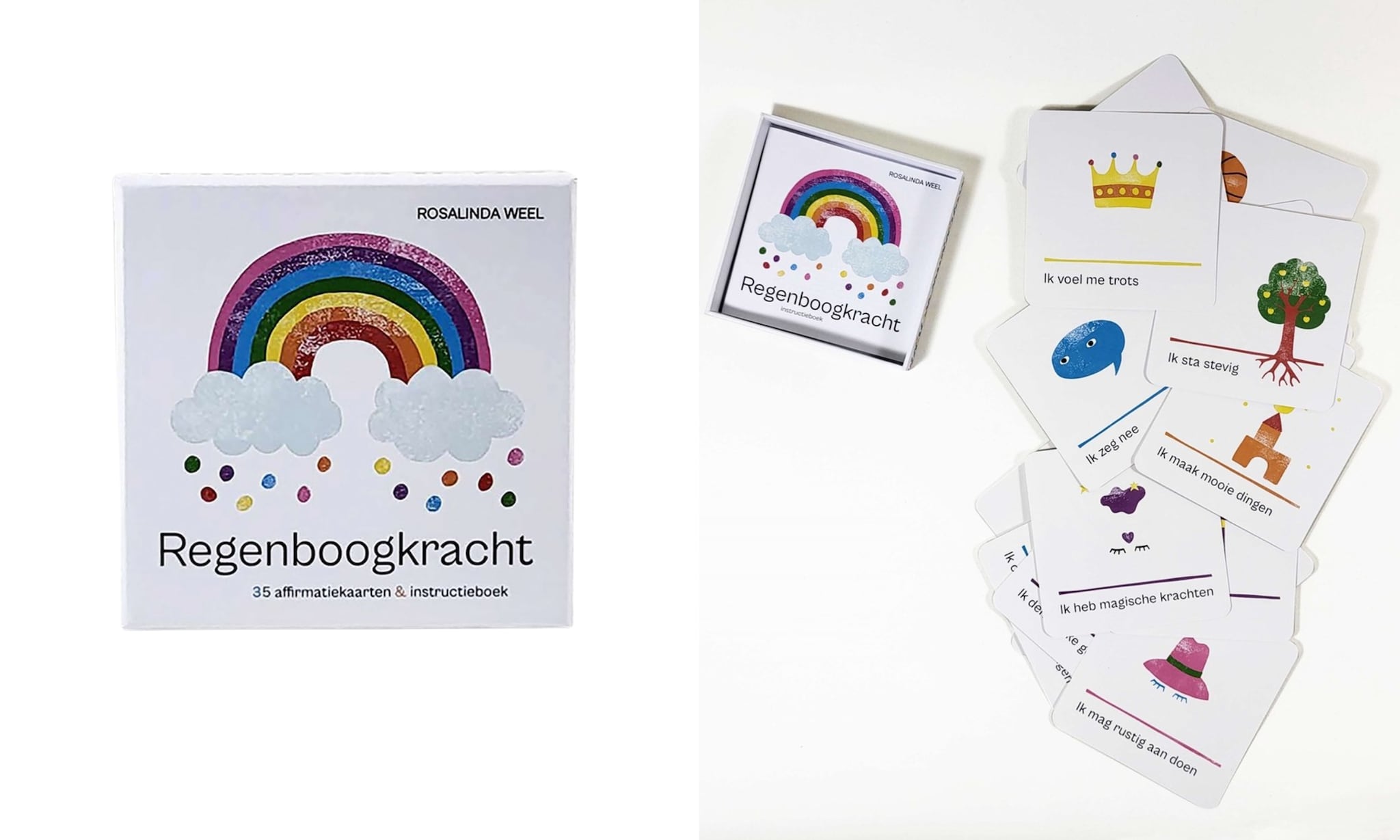De affirmatiekaartenset Regenboogkracht bestaat uit 35 kaarten met eenvoudige, vrolijke affirmaties die makkelijk te begrijpen zijn voor kleinere kinderen (vanaf circa 3 jaar). Ook zit er een instructieboekje bij die het gebruik van de kaarten nóg leuker maakt: per kaart vind je een aantal mooie begeleidende vragen en een kleine opdracht. Volgens de makers voor kinderen vanaf 4 jaar. € 16,99 via bol