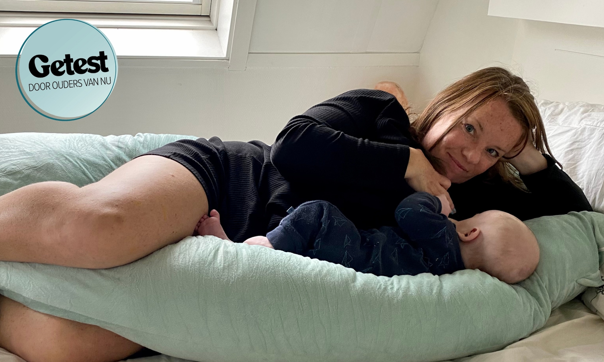 Ik gebruik het kussen intensief voor de nachtvoedingen. Dan leg ik het onder mijn hoofd en rondom mijn baby. Zo kan ik eventueel in slaap vallen tijdens het voeden en mijn baby ook, maar is hij wel beschermd tegen omrollen of de maaiende armen van mijn partner in hetzelfde bed. Als ik mijn baby terugleg in zijn co-sleeper, kan ik met het kussen tegen mijn rug aan ontspannen proberen verder te slapen.